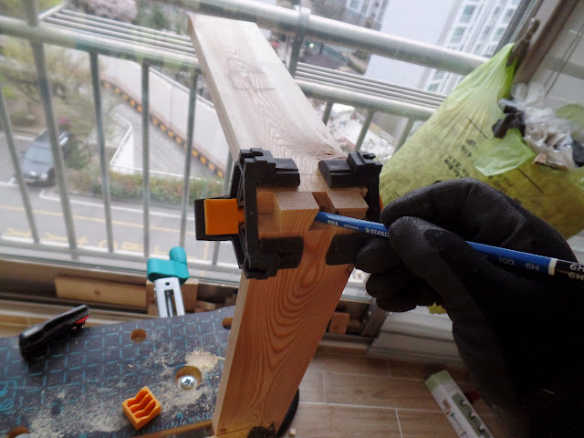 윗쪽에 선반으로 쓸 수 있는 공간이 만들어 졌는데, 제대로 활용하려면 담장이 있는 것이 좋습니다.  이 담장도 도브테일로 만듭니다.  그까이거 대충 대충 커피향을 음미하면서 만듭니다.  이번에는 타격끌을 위해서 아파트 지하주차장으로 잠시 다녀 왔습니다.