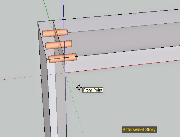 이제 이 마구리면에 박힌 목심이 들어갈 구멍 세개를 세로로 서있는 판재 윗면에 뚫어주어야 합니다. 그냥 계산에 의해서 그려주는 방법도 있지만 목심의 모양을 이용하여 편리하게 그리는 방법을 알아봅니다. 기본적인 개념은 장부맞춤에서 암장부를 그리는 방법과 유사합니다.